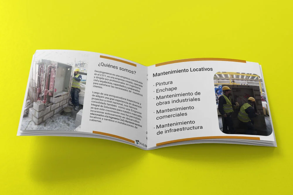 Pero nuestra colaboración con DecoIngenieros no se limitó al ámbito digital. Reconociendo la importancia de un material impreso de calidad para complementar su presencia en línea, nos embarcamos en el diseño de un brochure que no solo informara sobre sus servicios, sino que también capturara la esencia de su excelencia en ingeniería. Desde el diseño elegante y profesional hasta el contenido cuidadosamente seleccionado, cada aspecto del brochure fue elaborado con la máxima atención al detalle para asegurar que reflejara fielmente el prestigio y el profesionalismo asociados con DecoIngenieros.